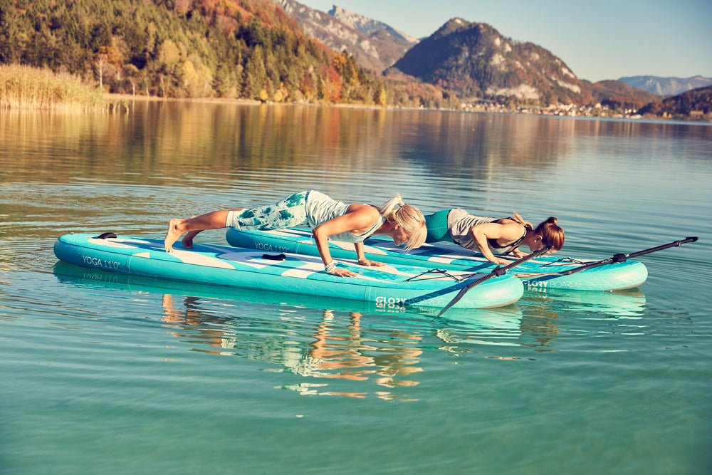 Mit diesem SUP Yoga Board kannst du Stand Up Paddling und Yoga vereinen. Das aufblasbare Allround SUP Board eignet sich sowohl für die anspruchsvollen SUP Yoga Übungen als auch für entspanntes Paddeln am See. Das aufblasbare SUP Yoga Board kannst du aufgrund des kleinen Packmaßes ganz einfach auch auf dem Fahrrad mitnehmen und am See deine morgendliche SUP Yoga Einheit genießen. Das rutschfeste Pad, das sich über das ganze Deck des SUP Boards zieht, ist gleichzeitig deine Yoga Matte, die du immer mit dabei hast!